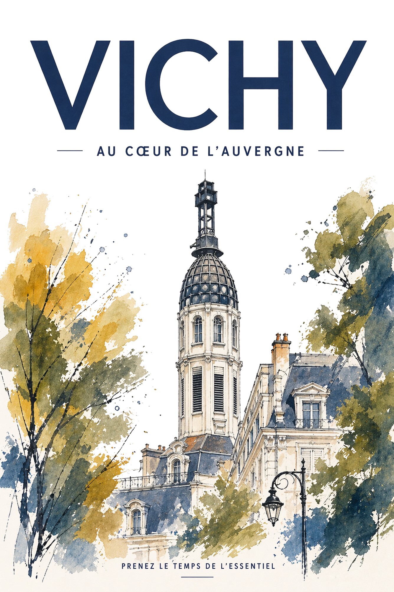 Avec son grand titre “Vichy – Au cœur de l’Auvergne”, cette affiche évoque l’élégance de la ville thermale, son patrimoine et son art de vivre.